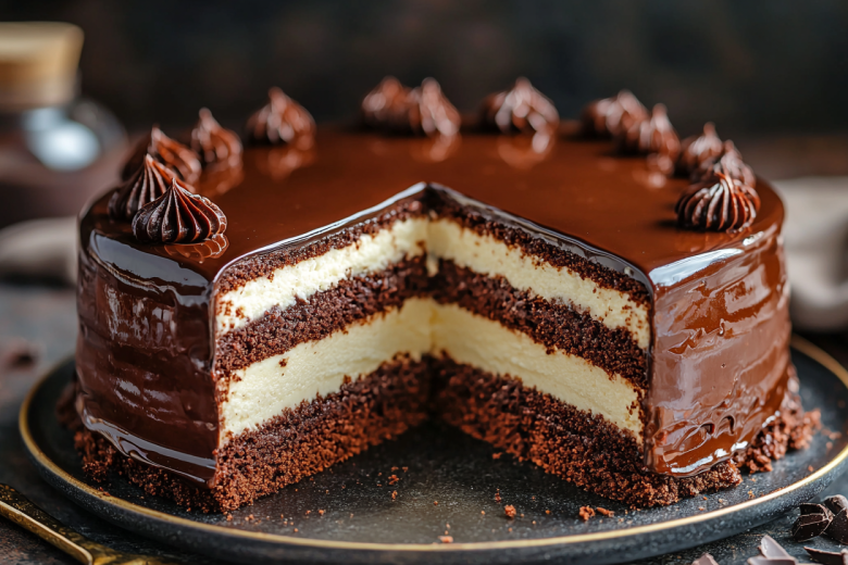Начинаю с коржа: взбиваю яйца с сахаром, добавляю растопленный остывший маргарин. Всыпаю просеянную муку с какао и разрыхлителем, замешиваю тесто. Выпекаю в разогретой до 180 °C духовке в форме 40 минут. Готовность проверяю зубочисткой. Даю коржу полностью остыть и разрезаю его вдоль на 2 пласта. Для суфле цедру и мякоть лимона измельчаю. Манку постепенно всыпаю в кипящее молоко, постоянно помешивая, и варю густую кашу 3–5 минут. Остужаю её полностью. В остывшую манную кашу добавляю сахар, размягченное масло и измельченный лимон. Взбиваю миксером 5–7 минут до пышной светлой массы. Собираю торт: на один корж выкладываю все суфле, накрываю вторым коржом, слегка придавливаю. Для глазури смешиваю сметану, сахар и какао, довожу до кипения, снимаю с огня, добавляю масло и перемешиваю. Остывшей, но ещё жидкой глазурью заливаю торт. Убираю в холодильник на несколько часов для пропитки.